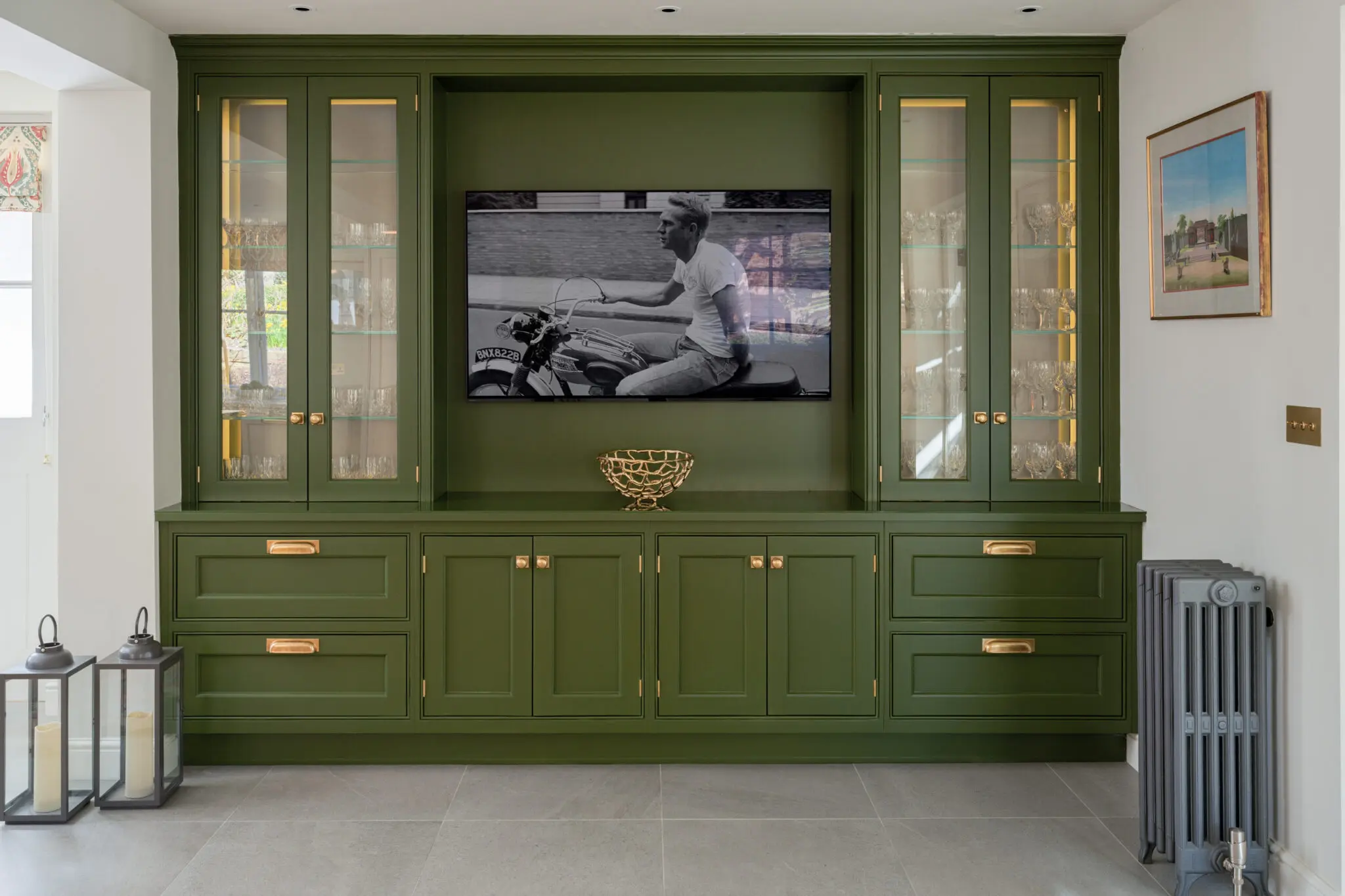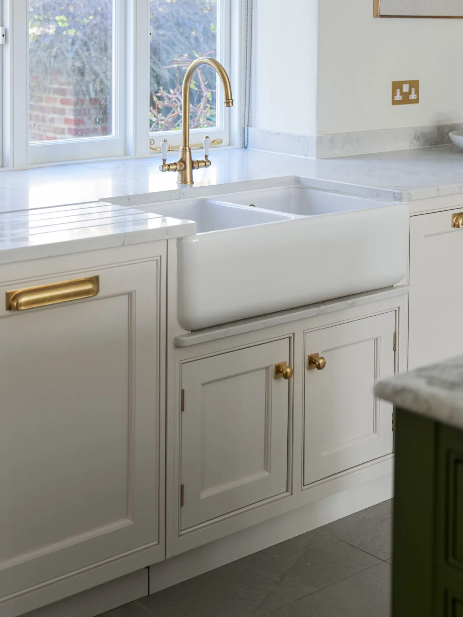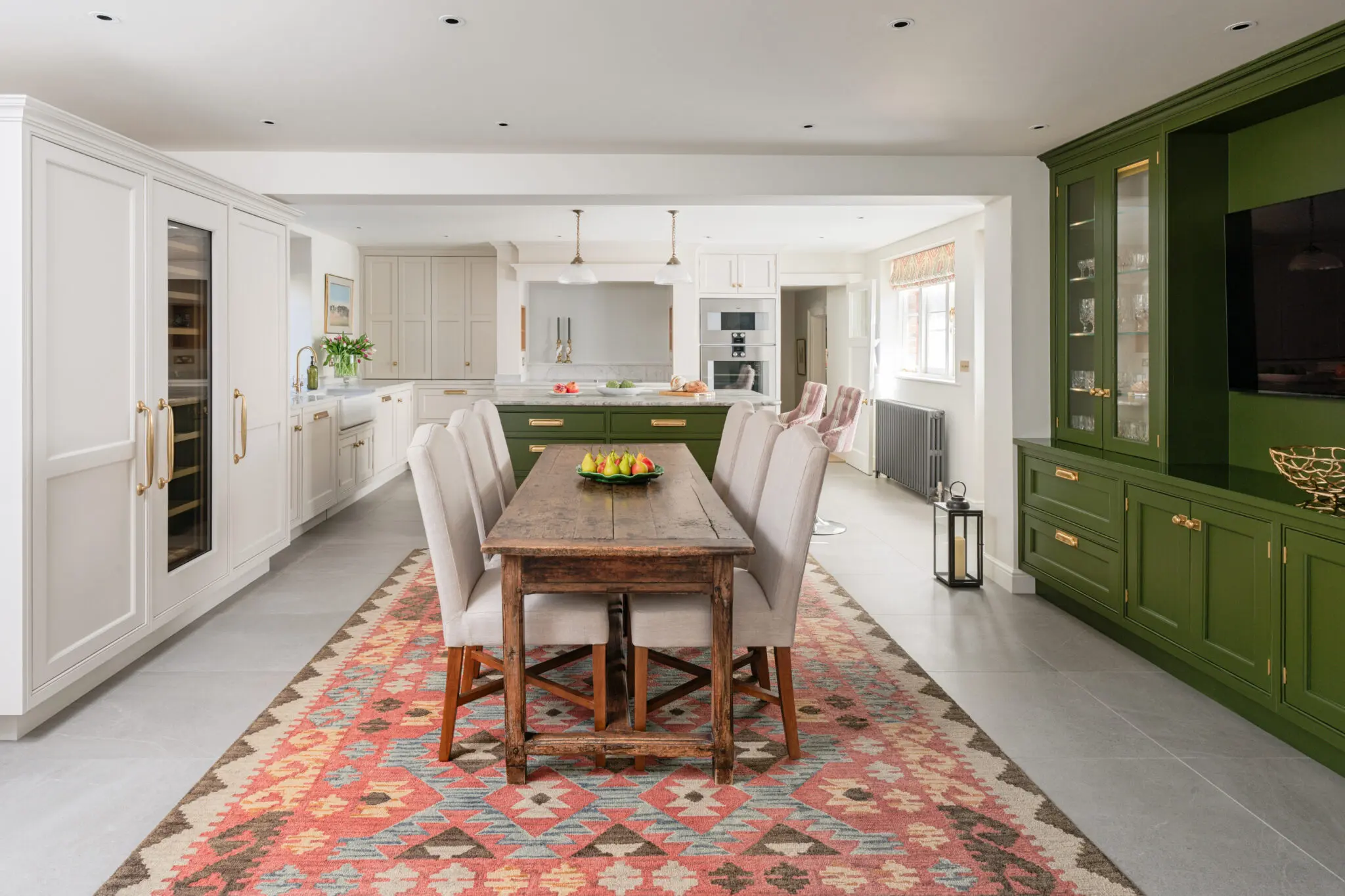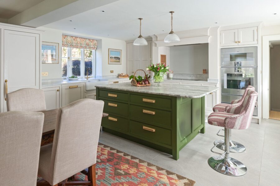The cabinetry, designed and handcrafted by Cheverell, was finished in a soft combination of Farrow & Ball and Little Greene Paint Company shades, creating contrast between lighter tones and deeper green accents. This colour palette gives the kitchen both balance and character, adding to the sophistication of the design.